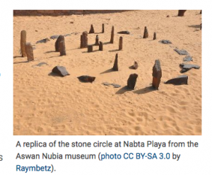 And also, perhaps, the excellence of stonework, including the moving of gigantic stones by humans. Older even than the pyramids or Stonehenge is a monument in the Nubian desert that was built perhaps 6500 years ago. Scientists believe Nabta was built by nomadic cattle-herders. Imagine cattle-herders laying 10 slabs of rock, nine feet high. Nine burial sites were created for cows each under 40 or 50 rocks that ea