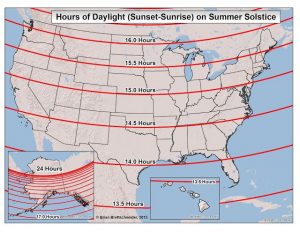 Our Earth doesn’t sit straight; it tilts. And as we travel on our planet around the Sun–at 18 1/2 miles per second–the tilt provides our seasons. Here in our Northern Hemisphere the longest, if not the warmest, day of the year will occur next Tuesday in my time zone. The Southern Hemisphere will be deep in its winter, experiencing its